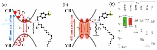 Relaxation mechanism of CsxFA(1−x)PbBryI(3−y) perovskite nanocrystals under (a) 480 nm and (b) 640 nm excitation conditions. (c) HOMO-LUMO estimations of the bulkier cyclic aromatic cations using DFT method. The VB and CB band positions of CsPbBr3 and CsPbI3 were taken from the literature [].