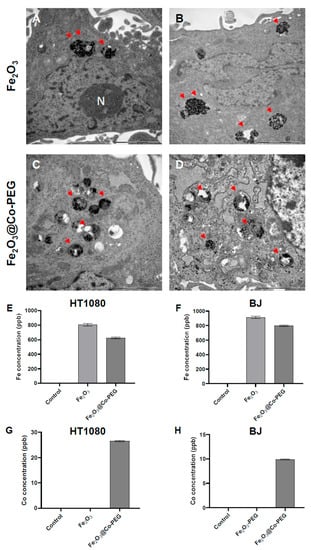 TEM was performed to visualize the uptake of particles. The HT1080 and BJ cells were exposed to 50 μg/mL of Fe2O3 or Fe2O3@Co-PEG nanoparticles for 24 h. The cells were then harvested and fixed in 2.5% glutaraldehyde in 0.1 M phosphate buffer (pH 7.4) at room temperature for 30 min and further fixed overnight in the refrigerator. After washing with 0.1 M phosphate buffer, the samples were centrifuged and post-fixed in 2% osmium tetroxide in 0.1 M phosphate buffer (pH 7.4) at 4 °C for 2 h. The samples were dehydrated in ethanol and acetone before being embedded in LX-112. Ultrathin sections (50–60 nm) were cut using a Leica EM UC6 microtome and being contrasted with uranyl acetate and lead citrate; the samples were examined using a Tecnai™ 12 Spirit Bio TWIN TEM at 100 kV. Digital images were captured using a Veleta camera (Olympus, Tokyo, Japan).