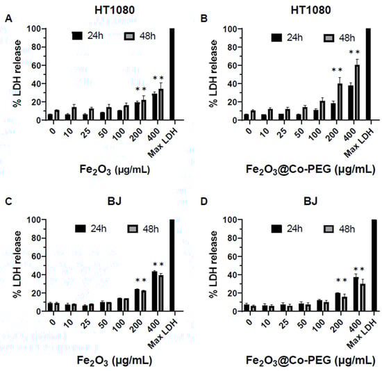 Cytotoxicity of polymer-coated iron oxide nanoparticles. The cytotoxicity towards HT1080 cells (A,B) and BJ cells (C,D), following exposure for 24 h or 48 h to the indicated concentrations of Fe2O3 nanoparticles (A,C) or Fe2O3@Co-PEG nanoparticles (B,D), was determined using the LDH release assay. Data shown are mean values ± S.E.M. of three independent experiments. * p < 0.05.