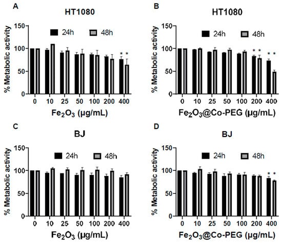 We then performed a cytotoxicity screening of Fe2O3 and Fe2O3@Co-PEG nanoparticles using the LDH release assay. No cytotoxicity was observed in the HT180 fibrosarcoma cells or BJ normal fibroblasts for both nanoparticles at concentrations up to 100 μg/mL (Figure 2A–D). However, at higher concentrations (200–400 μg/mL), cytotoxicity was observed; this was more pronounced for Fe2O3@Co-PEG as compared to Fe2O3 and more cytotoxicity was observed in HT1080 cells as compared to BJ cells (Figure 2A–D). To complement these results, we determined the metabolic activity of the two cell lines using the Alamar Blue assay, following exposure to the Fe2O3 and Fe2O3@Co-PEG nanoparticles (Figure 3A–D). The metabolic activity decreased more significantly in HT1080 cells at 24 h and 48 h than it did in BJ cells; this was observed for both nanoparticles. However, at the highest concentration, Fe2O3@Co-PEG appeared to be more cytotoxic compared to Fe2O3 for both cancer cells and fibroblasts (Figure 3A–D); thus, confirming the results obtained with the LDH release assay. We also investigated the cytotoxicity of soluble Co by exposing the cells to water-soluble Co (II) chloride (CoCl2). The metabolic activity of the HT1080 and BJ cells after exposure to CoCl2 was determined using the Alamar Blue assay. The results showed that (very) high concentrations of CoCl2 (100–200 μg/mL) significantly decreased the metabolic activity of HT1080 cells (Supplementary Figure S4A) and the effect was more pronounced at 48 h when compared to 24 h. The effect of CoCl2 was less pronounced in BJ cells; although, a dose-dependent effect was observed (Supplementary Figure S4B).