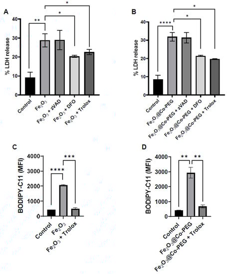 We then asked whether the maghemite nanoparticles triggered ferroptosis (at high concentrations). To this end, the two cell lines were exposed to the highest concentration (400 μg/mL) of Fe2O3 and Fe2O3@Co-PEG nanoparticles and cell death was monitored in the presence or absence of various cell death inhibitors. First, we noted that cell death was non-apoptotic as preincubation of the cells with the pan-caspase inhibitor zVAD-fmk failed to rescue the cells (Figure 4A,B). However, cells preincubated with the iron-chelating agent DFO or with the water-soluble vitamin E analog Trolox were significantly protected both from Fe2O3 and Fe2O3@Co-PEG nanoparticles (Figure 4A,B). Furthermore, lipid peroxidation was detected using the fluorescent probe BODIPY-C11. The results showed that Fe2O3 and Fe2O3@Co-PEG significantly increased the mean fluorescent intensity of BODIPY-C11 fluorescence when compared to the control, indicating the presence of lipid peroxides (Figure 4C,D). Moreover, Trolox completely reversed the lipid peroxidation induced by Fe2O3 and Fe2O3@Co-PEG (Figure 4C,D). Thus, these results showed that high concentrations of Fe2O3 or Fe2O3@Co-PEG triggered ferroptosis in the human HT1080 fibrosarcoma cell line. We also tested whether the cell death observed at high concentrations of these nanoparticles could be driven by other regulated necrosis pathways [23]. Specifically, we preincubated HT1080 cells with the necroptosis-inhibiting agent necrostatin-1. Interestingly, necrostatin-1 failed to rescue the cells exposed to Fe2O3 nanoparticles (Supplementary Figure S5A) while significant protection was observed in the case of Fe2O3@Co-PEG nanoparticles (Supplementary Figure S5B). Taken together, it appears that the Co-coated nanoparticles triggered mixed cell death (ferroptosis and necroptosis) in HT1080 cells.