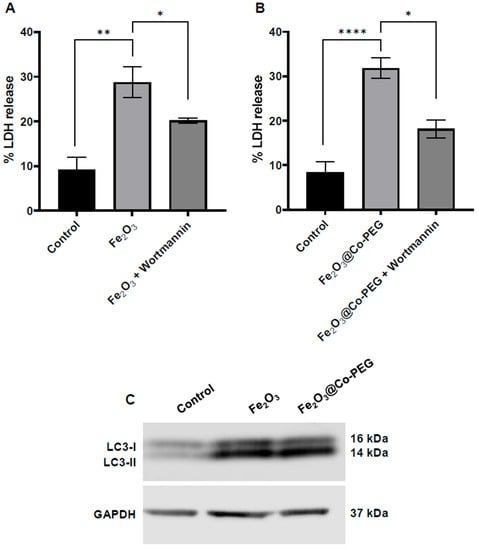 High-dose iron oxide nanoparticles trigger autophagy-dependent cell death. The percentage of LDH release in HT1080 cells after exposure for 24 h to (A) Fe2O3 nanoparticles and (B) Fe2O3@Co-PEG nanoparticles at 400 μg/mL in the presence or absence of the autophagy inhibitor, wortmannin (1 μM). Data shown are the mean values ± S.E.M. of three independent experiments. * p < 0.05; ** p < 0.01; **** p < 0.0001. The values for the control samples and nanoparticles alone in panels (A,B) are identical to the values shown in Figure 4A,B. (C) The expression of LC3-I and LC3-II was investigated by Western blot in HT1080 cells following exposure for 24 h to Fe2O3 and Fe2O3@Co-PEG nanoparticles at 400 μg/mL. GAPDH was used as a loading control.