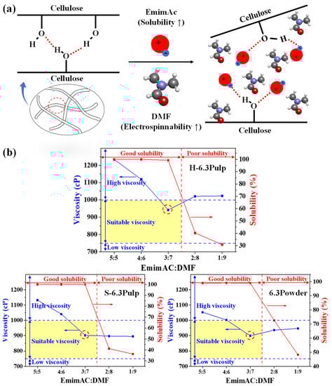 (a) Schematics of the cellulose dissolution mechanism in mixed solvents. (b) Viscosity and solubility characteristics of cellulose precursor solutions as a function of EmimAC and DMF mixing ratio.