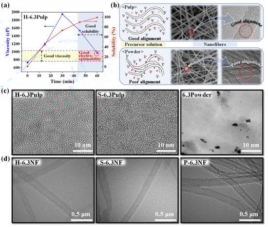 (a) Viscosity and solubility characteristics of H-6.3Pulp as a function of mixing time. (b) Schematic of the morphology conditions of the cellulose precursor solutions and cellulose nano-fibers. TEM images of (c) the cellulose precursor solution at a mixing time of 60 min and (d) the cellulose nanofibers.