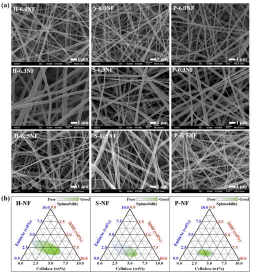 (a) SEM images of the H-NF, S-NF, and P-NF systems with various cellulose contents. (b) Ternary phase diagrams illustrating the suitable composition range for the production of the desired cellulose nanofibers.