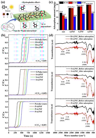 (a) Schematic of toluene adsorption on the cellulose nanofibers. Characteristics of toluene adsorption on the cellulose nanofibers: (b) adsorption breakthrough curves; (c) adsorption amount; and (d) FT-IR spectra before and after toluene adsorption.