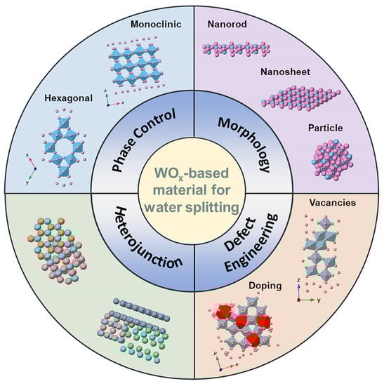 Various effective strategies have been developed to optimize nanostructures of tungsten oxide, thus further enhancing its catalytic properties, as shown in Figure 1. (1) Crystal phase regulation: different crystal phases of the samples have different degrees of interatomic d-sp orbital hybridization and lattice expansion, thus showing different band gaps and catalytic activities [41,42,43]. Tungsten oxide exhibits tunable catalytic properties due to its adaptable conversion between stoichiometric and non-stoichiometric crystal phases. (2) Morphology regulation: preparing tungsten oxides with various morphologies to expose different surfaces can optimize their adsorption free energy and intrinsic activity, which is of great significance to improve catalytic performances. Additionally, it is shown that the morphology regulation of tungsten oxide can effectively adjust the band gaps and the number of active sites [44]. (3) Defect engineering, including controlling the lattice vacancy and hetero atom doping, has also been used to enhance the intrinsic catalytic activity of tungsten oxide by effectively regulating the electronic structure and increasing the number of active sites [45,46,47]. Numerous experimental and theoretical findings have demonstrated that the introduction of defects to construct tungsten oxide with a non-stoichiometric ratio is more conducive to the adsorption/desorption of intermediate molecules (*H for HER; *OH and *OOH for OER) at the oxygen vacancy and doping sites [35,48,49]. (4) Benefiting from the synergistic effect, the construction of a heterostructure with specific interface configurations has been proved to be an effective way of reducing the reaction barrier of water splitting and promoting the adsorption and desorption of protons [36,50,51,52,53]. In this case, the highly efficient catalytic electrodes possess high electron transport capacity and large active surface area, which might provide sufficient active sites and appropriate adsorption strength. Numerous heterostructures with stable structures, high specific surface areas, and abundant active sites, including semiconductor–WOx, WOx–C, and metal–WOx heterostructures, have been developed [54,55,56,57]. These fantastic efforts substantially promoted the development of tungsten oxide-based electrocatalysts.