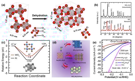 (a) Schematic of the orthorhombic unit cell of tungstite, which converts to the monoclinic tungsten oxide unit cell by dehydration at elevated temperatures (≥300 °C). Reprinted with permission from [83], with permission from Springer, 2014. (b) XRD patterns of orthorhombic WO3·H2O and monoclinic WO3. (c) Calculated energy landscapes of the HER on WO3 (200) and Pt (111). Reprinted with permission from [82], with permission from American Chemical Society, 2017. (d) Synthesis process and (e) linear sweep voltammograms at 2500 of hydrated tungsten oxide (WO3·nH2O, n values 0.33, 1.00, or 2.00) at room temperature. Reprinted with permission from [40], with permission from American Chemical Society, 2020.