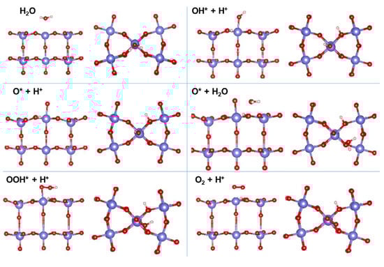 Hajiahmadi et al. explored the reaction mechanism and adsorption model of hex-WO3 (001) in acid oxygen evolution reaction (OER) (Figure 3) [85]. There are six adsorption models involved: (1) Initial state. The H2O adsorbs at the top of the central W site due to the lack of coordination of the central tungsten. (2) Water decomposes to form OH* and H+, which are the most stable configurations co-adsorbed at the top W site and adjacent O site, respectively. (3) Dehydrogenation of OH* to form O*. The dissociated hydrogen is adsorbed to another nearby oxygen. (4) The adsorption of water molecule on O*. (5) Dehydrogenation of O*-H2O to form OOH*. (6) Dehydrogenation of OOH* to form O2.