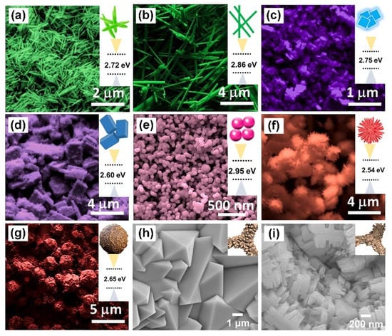 FESEM image and of bandgap (a) WO3 nanowires (W–NW), (b) WO3 nanorods (W–NR), (c) WO3 nanoflakes (W–NF), (d) WO3 nanobelts (W–NB), (e) WO3 nanoparticles (W–NP) of W–NP, (f) WO3 star-like structures (W–S), and (g) WO3 globule-like structures (W–G). Reprinted with permission from [44], with permission from Elsevier, 2022. FESEM image of octahedron-like (h,i) serrated Ni–WO3. Reprinted with permission from [91], with permission from Elsevier, 2022.
