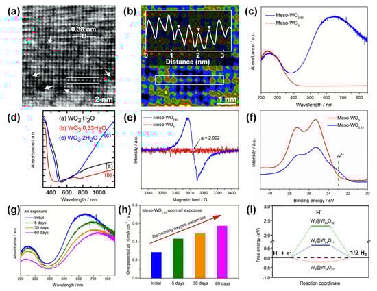 (a) TEM images (Numerous small pits shown by the arrows provide more coordinated unsaturated sites for OER electrocatalysis) and (b) colored atomic-resolution TEM image of WO3-Vo with a line profile of nine atoms (indicated by a box), the differences in intensity and contrast are further highlighted in the colored image and the line profile. Reprinted with permission from [89], with permission from the Chinese Chemical Society, 2020. (c) UV/vis diffuse reflectance spectra of Meso-WO3 and Meso-WO2.83. Reprinted with permission from [35], with permission from the Royal Society of Chemistry, 2018. (d) UV-vis absorption spectra of WO3·H2O, WO3·0.33H2O, and WO3·2H2O. Reprinted with permission from [40], with permission from the American Chemical Society, 2020. (e) EPR spectra at room and (f) XPS of Meso-WO3 and Meso-WO2.83. (g) UV/vis diffuse reflectance spectra and (h) the overpotential comparison at the current density of 10 mA cm−2 of the Meso-WO2.83 products upon air exposure time. Reprinted with permission from [35], with permission from the Royal Society of Chemistry, 2018. (i) Free-energy diagram for hydrogen adsorption at the W site on the WO3 (010) slab with different O vacancies. Reprinted with permission from [94], with permission from the American Chemical Society, 2017.