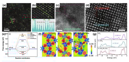 (a) HAADF-STEM image, (b) magnified HADDF-STEM image and corresponding intensity profiles of the line section, and (c,d) magnified HADDF-STEM images of Pt-SA/ML-WO3. (e) Calculated free energy profiles of HER at the equilibrium potential for WO3, WO3-VO/W, Pt-SA/WO3-VO, Pt-SA/WO3-VW, and metal Pt (111). Reprinted with permission from [104], with permission from Wiley, 2021. (f) Electron density difference isosurfaces (where red and blue areas indicate the charge accumulation and depletion, respectively) and (g) partial electronic density of states of WO3, Vo-WO3, and Vo-WO3/Ru SAs. Reprinted with permission from [136], with permission from Elsevier, 2022.