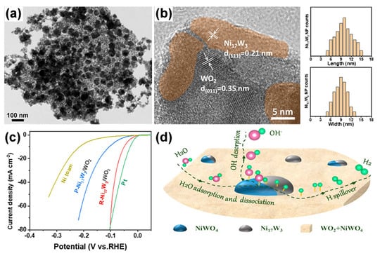 (a) TEM image of the Ni17W3/WO2. Reprinted with permission from Reprinted with permission from [150], with permission from the American Chemical Society, 2019. (b) HRTEM image and size distribution plots for R-Ni17W3/WO2 nanoparticles. (c) Polarization curves for Pt foil, Ni foam, P-Ni17W3/WO2, and R-Ni17W3/WO2. (d) Schematic diagram of R-Ni17W3/WO2 nanoparticles accelerating the rate of hydrogen evolution reaction. Reprinted with permission from [152], with permission from the American Chemical Society, 2021.