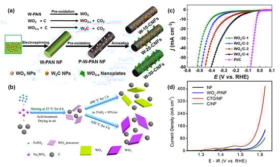 (a) Schematic diagram of WO3−x synthesis. Reprinted with permission from [95], with permission from the American Chemical Society, 2016. (b) Schematic diagram of WOx/C synthesis steps. (c) Polarization curves with iR compensation of the WOx/C in 0.5 M H2SO4 aqueous solution. Reprinted with permission from [179], with permission from Elsevier, 2021. (d) LSV polarization curves measured at a scan rate of 5 mV s−1 in 1 M NaOH. Reprinted with permission from [145], with permission from the American Chemical Society, 2020.
