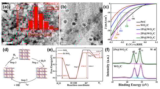 (a) FESEM and (b) HRTEM images of 2Pt@WO3/C. Insert of (a) is the size distribution. The white circle in (b) are Pt particles. (c) The polarization curves of WO3/C, 1Pt@WO3/C, 2Pt@WO3/C, and 3Pt@WO3/C. (d) the HER process and corresponding chemisorption models of Pt-WO3 in neutral media, and (e) the corresponding free energy level diagram. (f) XPS of WO3/C and 2Pt@WO3/C. Reprinted with permission from [156], with permission from Elsevier, 2022.