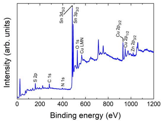 The synthesized nanoparticulate Cu2ZnSnS4 samples have been analyzed using XPS to check both the presence of Cu, Zn, Sn, and S and to verify the valence states of these constituent elements. The full XPS spectrum of the sample in Figure 2 shows the peaks of Cu, Zn, Sn, and S together with the C, N, and O peaks. It should be noted that the impurity peaks of C and O may be related to the reference or environmental contamination, and N to vestiges of the CH4N2S precursor. The valence state of elements in the CZTS was evaluated by high-resolution XPS spectra. Figure 3 shows the XPS high-resolution spectra. High-resolution spectra for all the core levels of interest (Cu 2p, Zn 2p3/2, Sn 3d5/2, and S 2p) were acquired, and also Cu LMM Auger transitions for better identification of the charge state for Cu, along with O 1s and C 1s. The spectra were calibrated at C 1s 284.8 eV. According to the Cu 2p spectra, a main peak is shown at 931.6 eV, and a secondary one at 932.1 eV, which can be related to Cu+ [45], probably due to the CuCl initial solution. As no satellites are visible at the spectra, no Cu2+ remains at the surface [4]. The assignment is also consistent with the calculated modified Auger parameter for each component reported to the Cu LMM Auger transition, taking values of 1849.3 and 1849.8 eV, respectively. According to the Zn 2p spectra, the main peak at 1021.5 eV corresponds to Zn2+. In reference to Sn 3d peaks, the mean peak appears at 486.7 eV, being related to SnO2 [45], possibly formed for the exposure of the samples to the air ambient oxygen. Finally, the S 2p peak was deconvoluted into two peaks: the main peak at 161.3 eV (S 2p3/2) is related to CuS [46], and the other at 162.5 eV (S 2p1/2) could be related to rests of the CH4N2S compound used for the prepared material. The valence states of Cu+, Zn2+, Sn4+, and S2− confirm that the synthesized CZTS simple is well consistent with its stoichiometric formula of Cu2ZnSnS4 [14].