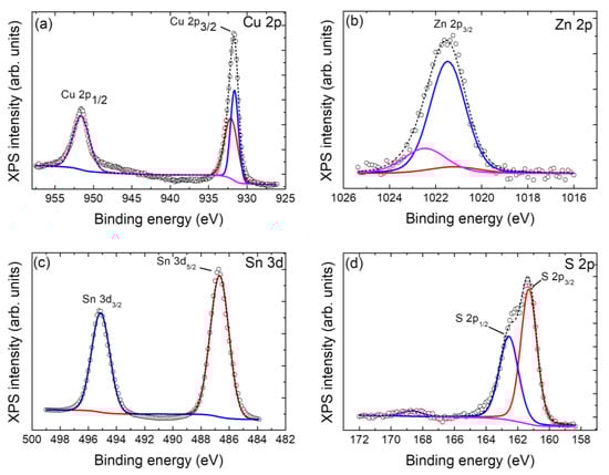 X-ray photoelectron spectroscopy high-resolution spectra for (a) Cu 2p, (b) Zn 2p, (c) Sn 3d, and (d) S 2p, for the Cu2ZnSnS4 sample. The short dashed black lines are the fit lines while the colored lines represent each component. The original spectra are represented as unfilled dots.