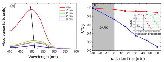 The optimal photocatalyst portrays the best performance, and its photocatalytic property remains after several photodegradation cycles; in fact, the stable recyclability of one photocatalyst is vital for future practical applications [18,62]. Then, recycling photodegradation experiments of nanoparticulate Cu2ZnSnS4 photocatalyst have been carried out, as shown in the inset of Figure 6b. The measurement was repeated three times to evaluate the stability and reusability of the photocatalyst (see the Experimental section for details). The inset of Figure 6b gives the degradation rate for the 3 cycles. The photocatalytic performance remained stable after the third cycle (a minor deviation (~14%) from the initial degradation efficiency has been observed), which further confirms that the stability and reusability of nanoparticulate Cu2ZnSnS4 photocatalyst are reasonable. However, this decrease in the dye photo-degradation efficiency after several runs can be mainly due to the CZTS photocatalyst mass loss during the successive filtering and washing processes in between each photodegradation run cycle (processes carried out in order to remove and reuse the photocatalyst material).