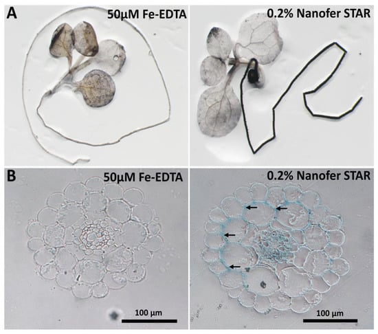 In order to investigate the effect of nZVI on plants, Arabidopsis thaliana seedlings were cultivated for 14 days in a solid nutrient medium supplemented with either a standard source of Fe (i.e., Fe-EDTA) or increasing concentrations of Nanofer STAR. In the first step, Nanofer STAR concentrations comparable to the standard medium were used for plant cultivation, ranging from 1 to 50 mg L−1 Fe (Figure S1). The exposure to such low concentrations of nZVI did not induce any visible beneficial or toxic effect, and, more importantly, the corresponding concentrations of Fe were not sufficient to be further visualized by histochemical staining []. Therefore, in the next step, higher nZVI concentrations were used in the nutrient medium, ranging from 0.2% to 1% (w/v), which corresponds to concentrations from 2 to 10 g L−1. The exposure to higher concentrations of Nanofer STAR resulted in a reduction of the root length and increased chlorosis (yellowing of leaves due to decreased accumulation of chlorophyll), in a dose-response manner (Figure S2). To gain more insight on the impact of nZVI on plants, the whole seedlings were stained for Fe using the Perls/DAB histochemical procedure that stains Fe atoms in tissues brown-black. Compared to the control plants, where Fe was mostly detectable in the leaf veins (Figure 1A, left panel), the exposure to 0.2% nZVI led to a massive accumulation of Fe in the roots (Figure 1A, right panel). For a more detailed analysis of Fe localisation within the roots, the roots were fixed and embedded in resin, and the corresponding thin sections were stained for Fe with K-ferrocyanide (Perls reagent), which reveals Fe as a blue colour (the Perls reagent alone is less sensitive but more quantitative than the Perls/DAB). As it is presented in Figure 1B, in comparison to the control, the roots exposed to 0.2% nZVI showed intensive iron accumulation in the intercellular space between the epidermal and cortex cells (marked with arrows) and also in the central cylinder, strongly suggesting that, to some extent, nZVI had been accumulated within the root tissues and that some Fe had been transferred to the conductive elements for the translocation to the above-ground parts of the plant.