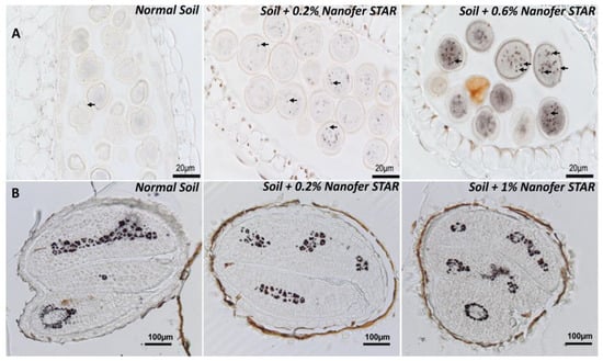 On the basis of these first findings, the impact of nZVI on longer exposures was monitored in order to assess the potential effects on a whole plant cycle (i.e., until the plants set seeds). For this purpose, Arabidopsis thaliana plants were cultivated in a greenhouse in soil supplemented with Nanofer STAR at the same concentrations as in the previous experiment. In comparison to the in vitro experiments, the same concentrations of Nanofer STAR applied directly to the soil (environmentally realistic exposure scenario) did not lead to visible symptoms of toxicity in the plant (or beneficial growth effect). In the case of a different commercially available nZVI, Yoon et al. [] showed that the presence of nZVI in soil, even at a high concentration, benefits shoot growth and enhances photosynthesis, suggesting that nZVI has the potential to be used as a nano-fertilizer. Afterwards, the total content of iron in the leaves, floral stems and seeds harvested from these plants was determined by microwave plasma atomic emission spectroscopy (MP-AES). The obtained results showed that exposure to nZVI provoked a two- to three-fold increase in the iron concentration in the leaves, and a two-fold increase in the stems, indicating that, to some extent, some of the Fe carried by nanoparticles was taken up by the plants and translocated to the upper organs (Figure S3). The next step focused on the flowers, more precisely, on the anthers, which are the organs responsible for the production of pollen that carry the male genetic material. Whole flowers from the control and nZVI-treated plants were fixed, embedded in resin, sectioned and stained with Perls/DAB. Strikingly, the exposure to nZVI did provoke some visible Fe accumulation in the anther cells and the pollen grains (Figure 2A, marked with arrows), compared to the control flowers. Moreover, this Fe accumulation was even more pronounced for the plants treated with 0.6% nZVI. In this case, the pollen grains showed an intense and uniform grey staining in the cytosol together with very intense Fe deposits, which were not observed in the pollen from the control plants (Figure 2A, right panel). These results indicate that the exposure to nZVI did provoke a massive Fe overload in all the above-ground organs, affecting even the reproductive organs. The chemical identity of these Fe deposits within the pollen grains remains to be determined, along with whether or not they correspond to intact nZVI that have been translocated from the roots to the flowers.