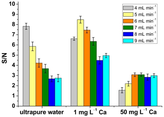 Signal-to-noise ratio obtained for three different matrices: ultrapure water, 1 mg L−1 Ca and 50 mg L−1 Ca at different hydrogen gas flows (4–9 mL min−1). Error bars represent the standard deviation of the measurement determined for 5 replicates.
