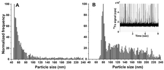 Size distributions of Nanofer 25S in the growth medium (A) freshly prepared and (B) after 7 days of incubation (part of the SP-ICP-MS/MS time scan is in the insert).