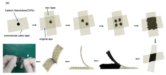 In previous studies, the solution-based method was used to disperse bundled CNTs; however, it involves chemical dispersing agents that are difficult to remove and ultrasound that breaks the CNT [45,46,47]. To avoid the use of chemical dispersing agents and ultrasounds, we developed a novel method inspired by mechanical exfoliation, which has been widely used to disperse two-dimensional materials from the bulk, for example, monolayer or few-layer graphene from bulk graphite. The raw carbon nanotubes from the CVD synthesis were transferred onto one adhesive tape, and another adhesive tape was then placed onto the former one with the CNT sample. The attached tapes were pressed to ensure that the CNT sample had good contact with both tapes. The tapes were then separated, and then attached again with a displacement, and the CNTs were separated into regions. Such processes were repeated multiple times until the trace of the CNTs uniformly covered the entire target region of the tape. This method is comparable to the mechanical exfoliation of two-dimensional materials from bulk van der Waals materials, except that the exfoliated samples are CNT bundles, and the goal is to cover a uniform CNT/tape network rather than a thin layer of 2D materials. The method is easy to operate, as shown in Figure 2a and can be used in laboratories for research or in factories for mass production. This method is versatile and can be applied to different substrate films, such as commercial latex, scotch, and band-aid tapes, as shown in Figure 2b.