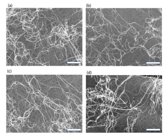 Raw CNTs were synthesized using chemical vapor deposition (CVD), as shown in Figure 1a and described in the Methods section. The visualization structure of the CNT consists of a cylindrical graphitic sheet rolled up with 100% black color. The average diameter and length of the CNTs are approximately 2–4 nm and 500 µm, respectively, and their surface area are ≥450 m2 g−1. Scanning Electron Microscopy (SEM) was used to observe micromorphology. The synthesized raw CNTs were bundled, as shown in Figure 1b. The bundling of the synthesized raw carbon nanotube causes agglomeration and nonuniformity, and the dispersion of the bundled sample is usually the first step towards a uniformly dispersed CNT film, which is a major challenge for the current mass production process, as discussed below.