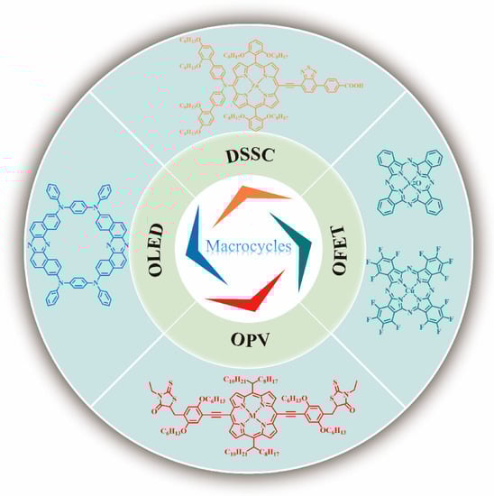 Macrocycles [1], compounds containing a ring of 12 or more atoms, have attracted tremendous attention from theoreticians [2], organic chemists [3,4,5,6], physicists [7], and materials engineers [8] due to their various properties [9] and applications [10,11], such as in organic photoelectric devices. Since the first observation of the macrocyclic compound cyclodextrin by Villiers in 1891, a series of macrocycles, such as cucurbiturils, calixarenes, phthalocyanines, porphyrins, crown ethers, and pillararenes, have been synthesized and extensively reviewed for their applications in host–guest chemistry. However, it was not until 1986, when Cu-phthalocyanine (as electron donor material) was first applied in organic photovoltaics (OPVs) [12], that macrocycles began to be used in the field of organic optoelectronic devices research. In comparison to the similar acyclic molecules or small molecules and polymers, macrocyclic organic semiconductor materials exhibit the following characteristics: (i) Quantum chemical calculations indicate that cyclic compounds possess smaller gaps between the highest occupied molecular orbital (HOMO) and the lowest unoccupied molecular orbital (LUMO) and more extended conjugation than their acyclic analogs. (ii) They exclude perturbing end-effects. (iii) The cyclic nature of these compounds alters their coordination behavior and structural features, which can improve molecular ordering in the solid state and facilitate charge carrier transport. (iv) Macrocyclization significantly reduces the molecular reorganization energy, thereby enhancing field-effect mobilities. (v) The robust backbone and intramolecular interactions of macrocycles inhibit nonradiative relaxation, leading to improved luminous efficiency in organic light-emitting diode (OLED) devices. (vi) Macrocycles can enhance the power conversion efficiency (PCE) of organic photovoltaics (OPVs) by promoting the generation of photogenerated carriers and enhancing carrier transport. As a result, cyclic compounds can be good materials in photoelectric devices, such as organic field-effect transistors (OFETs), OLEDs, OPVs, and dye-sensitized solar cells (DSSCs) (Figure 1).