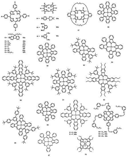 - Barker, C.A.; Zeng, X.; Bettington, S.; Batsanov, A.S.; Bryce, M.R.; Beeby, A. Porphyrin, Phthalocyanine and Porphyrazine Derivatives with Multifluorenyl Substituents as Efficient Deep-Red Emitters. Chem.—Eur. J. 2007, 13, 6710–6717. [Google Scholar] [CrossRef]