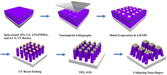 The schematic fabrication processes for a nano-finger array are shown in Figure 1. Hydrophilic surface treatment was first applied on a 3-inch silicon dioxide substrate to increase the adhesion between the substrate and the following first UV resist layer. After the surface treatment, a layer of 600 nm 15% UV nanoimprint resist (EZImprinting Inc., Los Angeles, CA, USA) was spin-coated on the substrate at 1500 rpm for 30 s. Before UV curing, nitrogen gas was purged into the curing chamber for 20 min to minimize any degraded UV film caused by oxygen (O2) in the air. A UV lamp with a power of 4 mW/cm2 and a wavelength of 365 nm was therefore used to cure the UV resist for 2 min under the nitrogen ambient. A layer of 100 nm 3.5% PMMA (MilliporeSigma, Munich, Germany) dissolved in anisole (MilliporeSigma, Munich, Germany) as a lift-off layer was spin-coated at 4000 rpm for 60 s on the 15% UV resist, followed by baking at 180 °C for 10 min. A layer of 100 nm 4.1% UV nanoimprint resist (EZImprinting Inc.) was spin-coated at 2500 rpm for 10 s on the lift-off layer. NIL was performed to form a two-dimensional hole array on the 4.1% UV resist layer. The residual layer was then etched using RIE (PlasmaPro RIE 80, Oxford Instruments, Abingdon, Oxfordshire, UK) to expose the bottom 15% UV resist layer. A layer of 2 nm Ti (99.995%, Kurt J. Lesker Company, Jefferson Hills, PA, USA) as an adhesion layer and a layer of 50 nm Au (99.999%, Kurt J. Lesker Company, USA) was evaporated via an e-beam evaporator (PRO Line PVD 75, Kurt J. Lesker Company, USA) on the sample. In the lift-off process, an acetone bath at room temperature for 10 min was used to dissolve the PMMA layer (i.e., lift-off layer) to remove undesired Au films. After the lift-off process, an Au nanoparticle array on the 15% UV resist layer was left. The sample was then etched using RIE to achieve a high-aspect-ratio nano-fingers array. For each nano-finger, there is an Au nanoparticle on top of a 15% UV resist pillar. A 2 nm amorphous TiO2 film was deposited on the nano-fingers with a growing temperature of 100 °C using a plasma-enhanced ALD (Ultratech Simply ALD, Veeco) to encapsulate the Au nanoparticles on top of the 15% UV resist pillars. Finally, the nano-fingers were soaked in ethyl alcohol 200 proof solution (Decon Labs, King of Prussia, PA, USA) and then air-dried at room temperature. The capillary force from ethyl alcohol evaporation leads to adjacent nano-fingers collapse together.