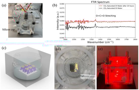 (a) Air-tight PMMA reaction cell used for the CO2RR in this study; (b) FTIR spectra of fresh CO2-saturated DI water and CO2-saturated DI water after 24 h; (c) Schematic diagram of the air-tight reaction cell with a nano-finger array soaked in 25 mL CO2-saturated DI water; (d) Photograph of a nano-finger array immersed in 25 mL CO2-saturated DI water with many CO2 bubbles; (e) Photograph of a 638 nm laser focused on a nano-finger array placed inside the reaction cell with 25 mL CO2-saturated DI water.