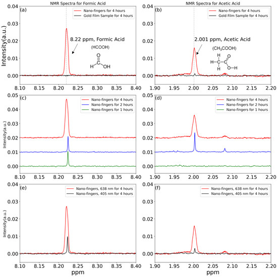 1H-NMR spectra of liquid samples (a,b) with a nano-finger array and a gold film sample; (c,d) with a nano-finger array after different irradiation times; (e,f) with a nano-finger array under different incident wavelengths.