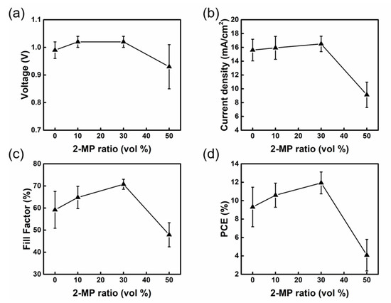 Variation in photovoltaic characteristics of slot-die coated PSCs fabricated with different 2-MP ratios. (a) VOC, (b) JSC, (c) FF, and (d) PCE.