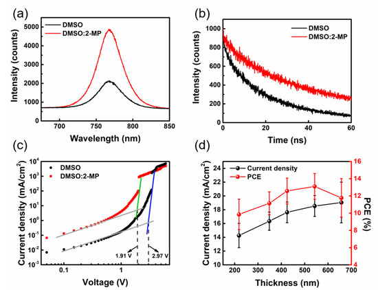 Comparison of slot−die coated perovskite films prepared from DMSO and DMSO:2−MP (70:30 vol%). (a) PL spectrum, (b) TRPL kinetics, (c) SCLC curve, and (d) variation in current density and PCE according to the thickness of slot-die coated perovskite films.