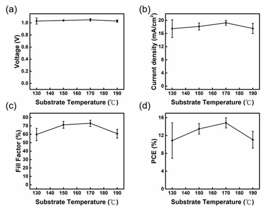 The slot-die coating process involves the immediate volatilization of solvent during the perovskite film formation, causing the rapid formation of the perovskite crystal. The efficiency of the planar structure perovskite solar cell is influenced by the surface morphology and crystallinity of the perovskite thin film. Because we used the slot-die coating method to deposit the perovskite film directly on the preheated FTO/NiOX substrate, we have to examine the effect of substrate temperature on the device performance. Figure 4a–d displays the trend of devices’ photovoltaic characteristics operated at various substrate temperatures, and the detailed values are listed in Table S5. When the substrate temperature is below 170 °C, the solvent cannot volatilize quickly, resulting in incomplete crystallization of the perovskite film and poor JSC and FF. The JSC and FF reach their maximum at the substrate temperature of 170 °C. When the substrate temperature is raised to 190 °C, which is over the boiling point of DMSO, the solvent quickly volatilizes and generates an irregularly arranged perovskite crystal with many cracks. XRD data is shown in Figure S6. The diffraction angles at 14.1°, 19.8°, 28.5°, and 40.5° are the Bragg diffraction peaks corresponding to the (110), (112), (220), and (224) planes of the methylamino lead iodide (MAPbI3) perovskite crystal. When the substrate temperature is below 170 °C, the perovskite film has no crystallographic orientation. When the substrate temperature is set to 170 °C, the diffraction intensity of the (112) plane is significantly increased, whereas the intensity of the (110) plane is decreased. This phenomenon illustrates that the crystal prefers to grow in the direction perpendicular to the (112) plane. The preferential crystal orientation would make the perovskite crystal stacked more tightly with fewer grain boundaries, resulting in better photovoltaic properties [39].