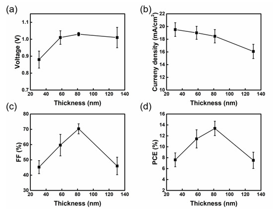 Variation in thickness with different parameters of (a) VOC, (b) JSC, (c) FF, and (d) PCE of the PSCs fabricated with different PC61BM thicknesses.