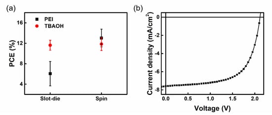 - Lee, H.-J.; Na, S.-I. Performance improvement of slot-die-deposition based perovskite solar cells using diglycolic acid additives. Mater. Lett. 2022, 312, 131651. [Google Scholar] [CrossRef]