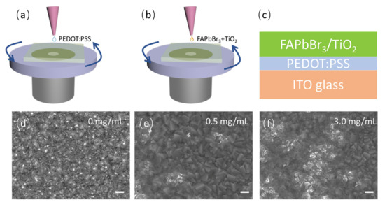 (a) Schematic of the growth of PEDOT:PSS buffer layer by using one-step spin-coating method; (b) schematic of the growth of FAPbBr3(TiO2) active layer by using one-step spin-coating method; (c) the structure of the prepared FAPbBr3/TiO2 thin films on ITO-coated glass; the surface appearance of (d) FAPbBr3 thin films; (e) 0.5 mg/mL and (f) 3.0 mg/mL TiO2-nanoparticle-decorated FAPbBr3 thin films measured by using a scanning electron microscope (the scale bar is 1 µm).