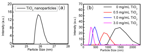 (a) The particle size distribution of TiO2 nanoparticles; (b) the particle size distribution of FAPbBr3 crystals with concentrations of TiO2 at 0 mg/mL, 0.5 mg/mL, 1.0 mg/mL, and 3.0 mg/mL.
