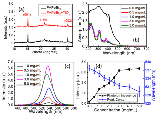 (a) X-ray diffraction spectra of the FAPbBr3 and FAPbBr3/TiO2 thin films; (b) room-temperature ground-state absorption spectra of the FAPbBr3 and FAPbBr3/TiO2 thin films; (c) photoluminescence emission spectra of the FAPbBr3 and FAPbBr3/TiO2 thin films excited by a continuous-wave laser at 405 nm; (d) the photoluminescence emission intensity and wavelength versus the concentration of TiO2 nanoparticles.