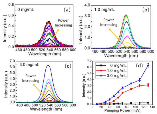 (a) Photoluminescence spectra of the FAPbBr3 thin films under different pumping power; (b) photoluminescence spectra of the FAPbBr3 thin films with 1.0 mg/mL TiO2 nanoparticle decoration under different pumping power; (c) photoluminescence spectra of the FAPbBr3 thin films with 3.0 mg/mL TiO2 nanoparticle decoration under different pumping power; (d) photoluminescence intensity changes in FAPbBr3 thin films with and without TiO2 nanoparticle decoration versus pumping power.