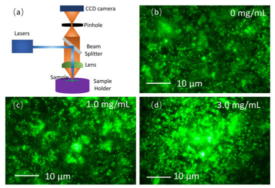 (a) Schematic of the home-built confocal microscope; micro-scale photoluminescence distribution in (b) FAPbBr3 thin films, (c) FAPbBr3 thin films with 1.0 mg/mL TiO2 nanoparticle decoration, and (d) FAPbBr3 thin films with 3.0 mg/mL TiO2 nanoparticle decoration.