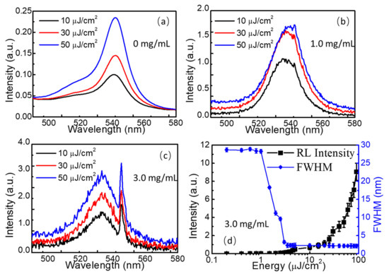 (a) Photoluminescence spectra of the FAPbBr3 thin films; (b) weak narrow peaks from random lasing emission in FAPbBr3 thin films with 1.0 mg/mL TiO2 nanoparticle decoration; (c) sharp random lasing emission spectra in FAPbBr3 thin films with 3.0 mg/mL TiO2 nanoparticle decoration; (d) the intensity of the output random lasing emission and FWHM changed along with the increase in excitation energy.