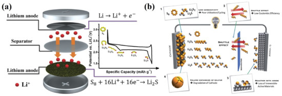 Therefore, researchers have turned their attention to other cathode materials with a high theoretical capacity. Among various potential cathode materials, lithium–sulfur batteries (LSBs) have attracted much attention as a potential low-cost and efficient energy storage system due to the advantages of high theoretical capacity (1675 mAhg−1), high energy density (2600 Whkg−1), wide sources and low cost of elemental sulfur [7,8]. LSBs consist of elemental sulfur as the cathode, an electrolyte, a separator and lithium metal as the anode. Through the multi-electron electrochemical conversion between sulfur and lithium, LSBs could give rise to a much higher specific capacity than that of traditional lithium batteries.