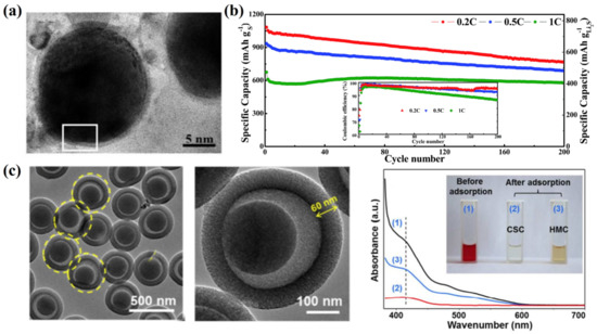 (a) TEM images of the core–shell structure Li2S@C nanocomposites [61]. Reprinted with permission from Ref. [61]. Copyright 2012 Royal Society of Chemistry (the white square highlights the carbon layer on the Li2S particle). (b) The cyclic performances of the nanocore–shell Li2S@C composites [62]. Reprinted with permission from Ref. [62]. Copyright 2012 Royal Society of Chemistry. (c) TEM images and anchoring ability for polysulfides of hollow yolk-and-shell carbon spheres [63]. Reprinted with permission from Ref. [63]. Copyright 2017 American Chemical Society.