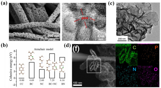 Compared to the single doping effect, the co-doping of heteroatoms can effectively combine the advantages of different heteroatoms, which can greatly improve the conductivity of carbon matrix and the adsorption of polysulfide. Diketoxime (DMG) and nickel chloride tetrahydrate (NiCl2·4H2O) were used as precursors for the preparation of nitrogen and oxygen co-doped porous carbon microrods with a large specific surface area and high porosity (Figure 8a) [69]. Based on the density functional theory (DFT) calculation, it is confirmed that the introduction of nitrogen and oxygen heteroatoms can effectively improve the adsorption capacity of the carbon matrix toward polysulfides and greatly inhibit the shuttle effect, which significantly improves the electrochemical performance of LSBs. Graphene oxide nanoribbons were modified by adding boric acid and urea to obtain nitrogen and boron co-doped curved graphene nanoribbons [70]. It was found that the reaction of the boric acid/urea precursor could promote the co-doping process of nitrogen and boron. In addition, the rich N-B motifs could significantly improve the electron conductivity, sulfur dispersion and polysulfide adsorption capacity of the electrodes. Wang et al. developed an effective strategy to improve the electrochemical performance of sulfur electrodes via the preparation of nitrogen/sulfur co-doped graphene matrix for the cathode material of LSBs [71]. In addition to the chemical anchoring of polysulfide by the nitrogen and sulfur defect sites, nitrogen and sulfur atoms with high electronegativity lead to the polarization of adjacent carbon atoms and oxygen-containing functional groups, which could increase the adsorption activity of sulfur and polysulfide. At the same time, the highly developed defects and edges and the porous structures obtained via the chemical activation of graphene not only achieve good dispersion of sulfur, but also act as a polysulfide reservoir to mitigate the shuttle effect. In addition, lithium iron phosphate nanoparticles were adopted as a hard template to prepare nitrogen, oxygen and phosphorus co-doped hollow carbon nanocapsules/graphene composites as the sulfur cathode [72]. The shuttle effect of polysulfide could be greatly inhibited by the physical and chemical adsorption of the abundant surface polar groups on the composite material.