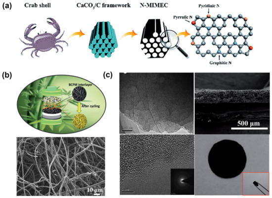 As shown in Figure 13a, discarded crab shells were employed as a precursor to yield functional carbon materials through potassium hydroxide-assisted pyrolysis [105]. Due to the intrinsic rich keratin content contained in the crab shells, nitrogen doping could be easily introduced during pyrolysis. As deposited on the membrane surface of the separator, the surface wettability is greatly improved and strong chemisorption of polysulfides is formed, which could effectively enhance the electrolyte permeability, the transportation of lithium ions and the adsorption of the modified separator. As depicted in Figure 13b, bamboo chopsticks were used to prepare carbon fibers as an interlayer for LIBs with excellent electrochemical performances [106]. When used as an interlayer for LSBs, soluble polysulfides can be effectively adsorbed in the bamboo carbon fiber sandwich membrane, and the shuttle effect is substantially suppressed. At the same time, the cross-linked three-dimensional conductive framework constructed by the fiber structure also provides an interworking conductive network, which promotes both the electronic transport and the diffusion rate of lithium ions. In addition, sulfur-doped microporous carbon materials could be prepared from loofah pulp biomass. The as-prepared self-supporting porous carbons could effectively prevent the diffusion of polysulfides to improve the electrochemical performance of LSBs [107]. The mechanism studies indicated that the rich microporous structure and sulfur-doping sites could be used as both physical and chemical adsorption sites, which could effectively adsorb polysulfides in the conductive framework and avoid the irreversible loss of active substances, leading to high sulfur utilization and high cycle stability. Recent research progresses regarding biomass-derived carbons adopted as an interlay in LSBs are summarized in Table S2.