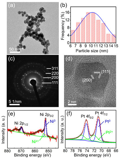 The XPS spectra of Ni (Figure 1e) and Pt (Figure 1f) were calibrated using the C 1s peak at a binding energy of 284.6 eV as a reference. Three pairs of double peaks can be fitted in Figure 1e: Ni0, Nix+, and the Ni−satellite peaks [15]. The peaks located at 869.73 and 852.24 eV correspond to Ni 2p1/2 and Ni 2p3/2, respectively. According to the XPS handbook, the Nix+ peaks, located at 871.24 and 853.75 eV, can be assigned to oxidized Ni (Ni2+) [33]. Similarly, for the Pt 4f spectrum shown in Figure 1f, two pairs of double peaks can be fitted, which are attributed to metallic Pt0 peak (74.22 and 70.89 eV), and the Pt2+ peak (75.48 and 72.15 eV) in PtO or Pt(OH)2 [15,31,34]. It is noted that the XPS signal of Ni is weaker than that of Pt, presumably suggesting the lower Ni content or the Ni−scarce surface of the NPs. After all, as a surface analysis technique, XPS can only probe the elemental signals from the top few nanometers of the analyzed samples.