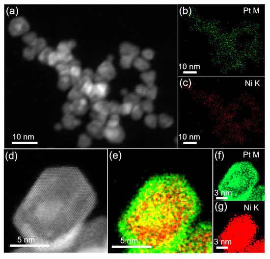 (a) STEM image of NiPt TONPs; corresponding EDS elemental mappings of Pt (b) and Ni (c); (d) representative HAADF−STEM image of a typical NiPt TONP; and (e–g) corresponding Pt and Ni elemental mappings.